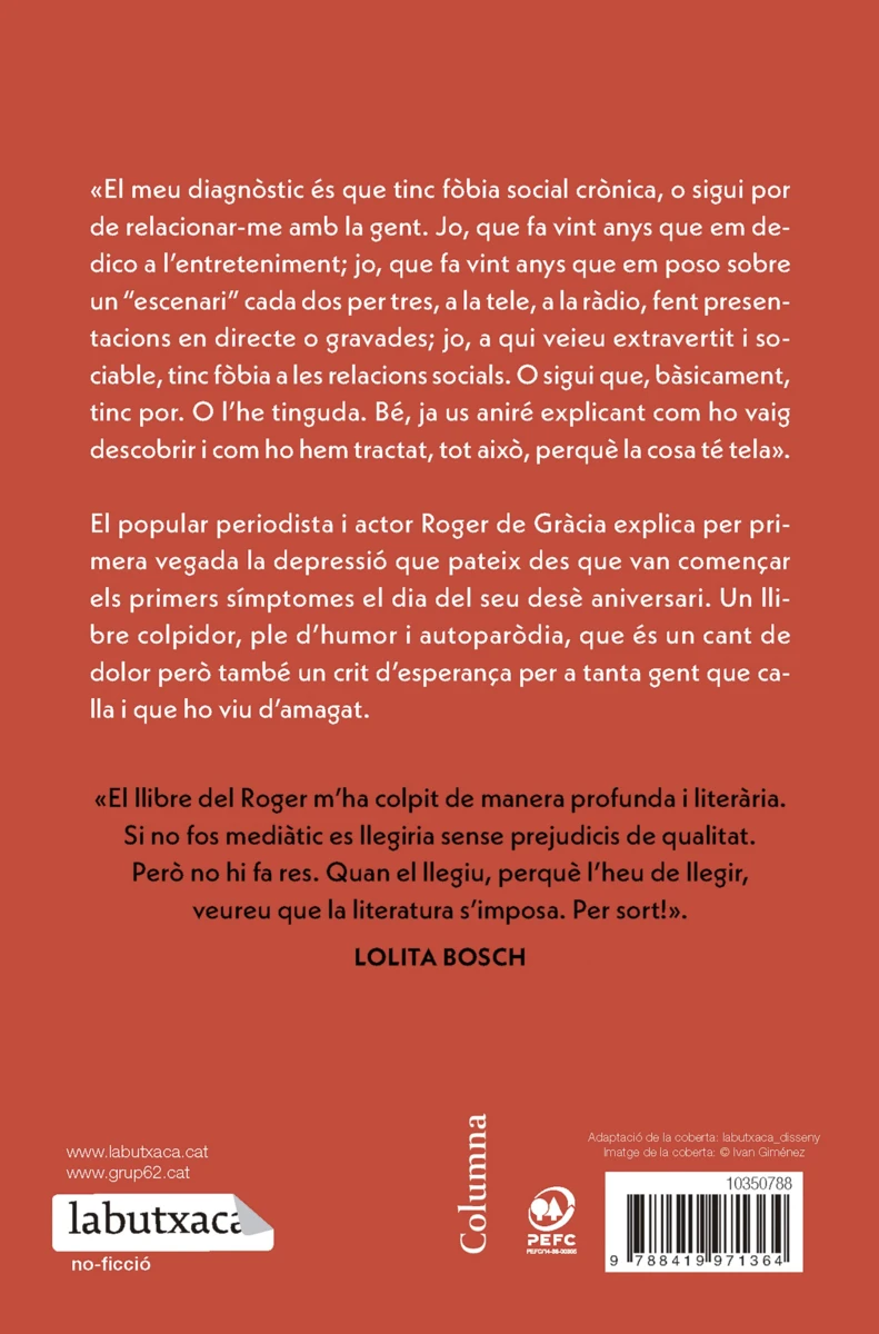«El meu diagnòstic és que tinc fòbia social crònica, o sigui por de relacionar-me amb la gent. Jo, que fa vint anys que em dedico a l’entreteniment; jo, que fa vint anys que em poso sobre un “escenari” cada dos per tres, a la tele, a la ràdio, fent presentacions en directe o gravades; jo, a qui veieu extravertit i sociable, tinc fòbia...