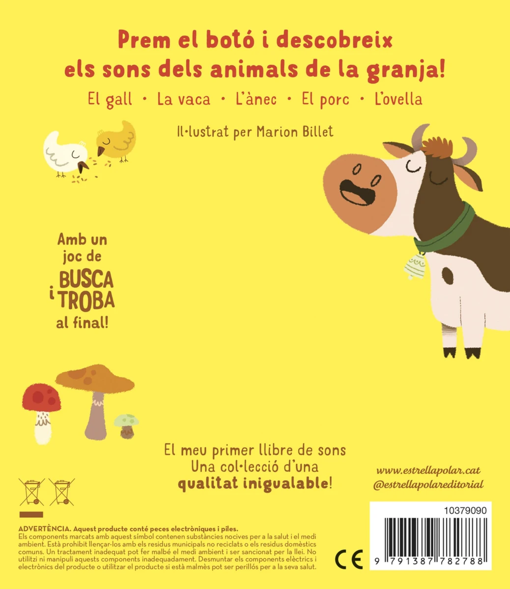En aquest llibre de cartró trobaràs 5 imatges i 5 sons relacionats amb els animals de la granja: el gall, la vaca, l’ànec, el porc i l’ovella i… un botó aleatori sorpresa!