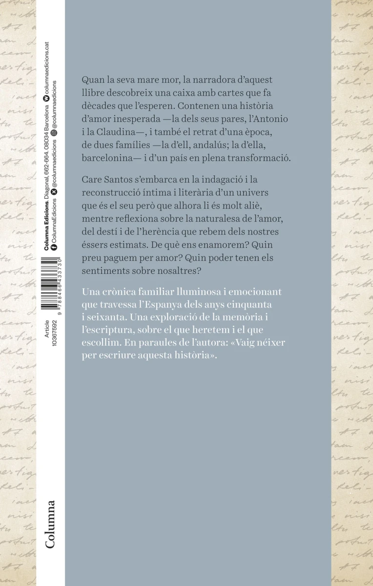Quan la seva mare mor, la narradora d’aquest llibre descobreix una caixa amb cartes que fa dècades que l’esperen. Contenen una història d’amor inesperada —la dels seus pares, l’Antonio i la Claudina—, i també el retrat d’una època, de dues famílies —la d’ell, andalús; la d’ella,...