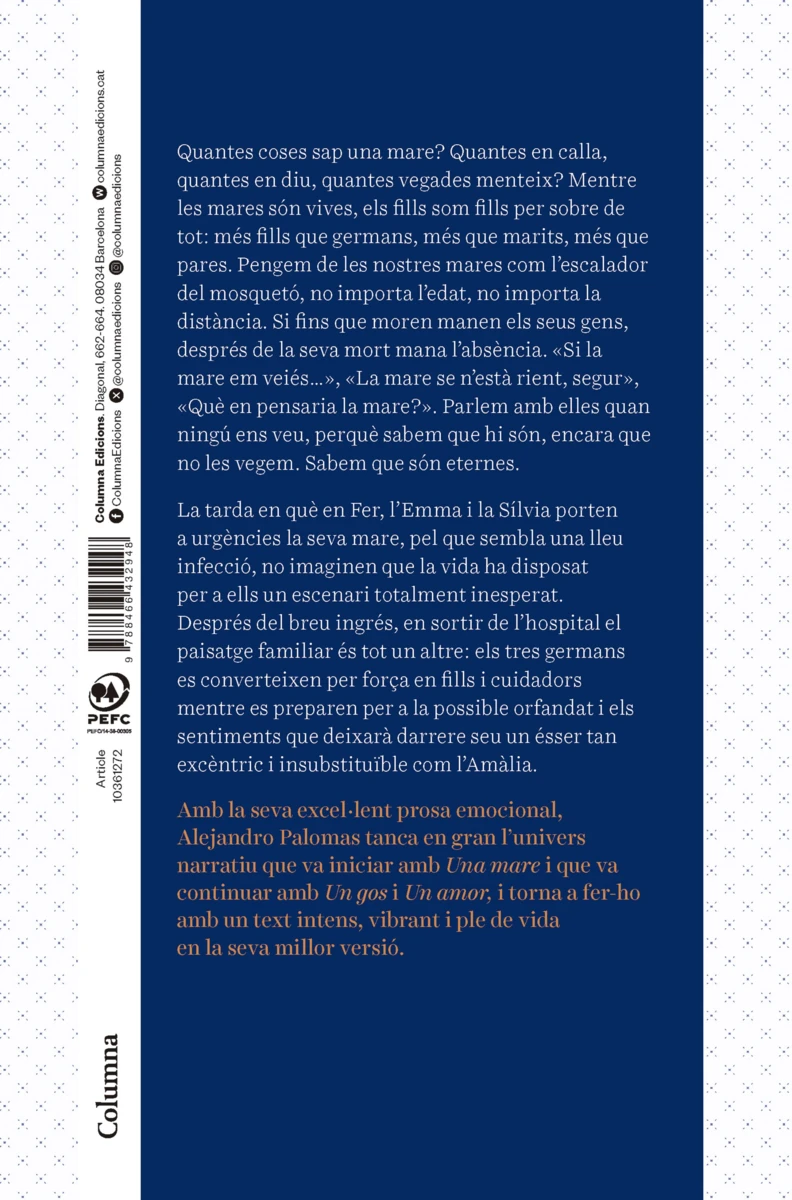 Quantes coses sap una mare? Quantes en calla, quantes en diu, quantes vegades menteix? Mentre les mares són vives, els fills som fills per sobre de tot: més fills que germans, més que marits, més que pares. Pengem de les nostres mares com l’escalador del mosquetó, no importa l’edat, no...